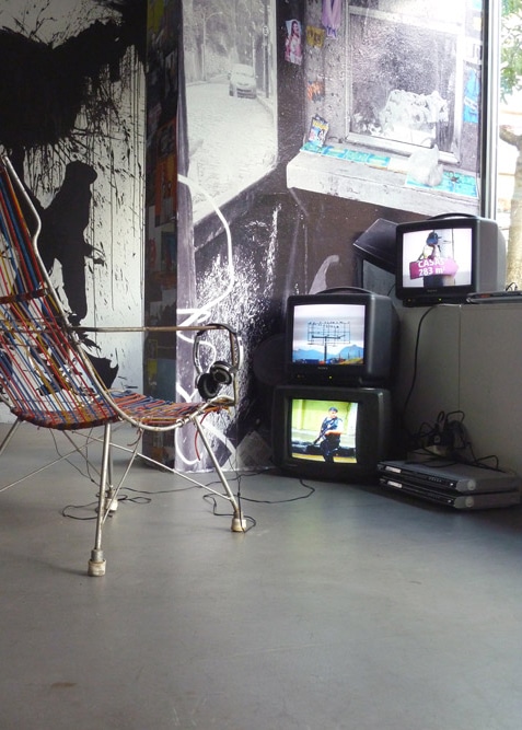 A large number of photographs, photo collages, a window sticker and a large wall sticker make up part of this installation together with three simultaneously running slide shows displayed on TVs. They show an abundance of images of Sao Paulo and other places in Brazil.